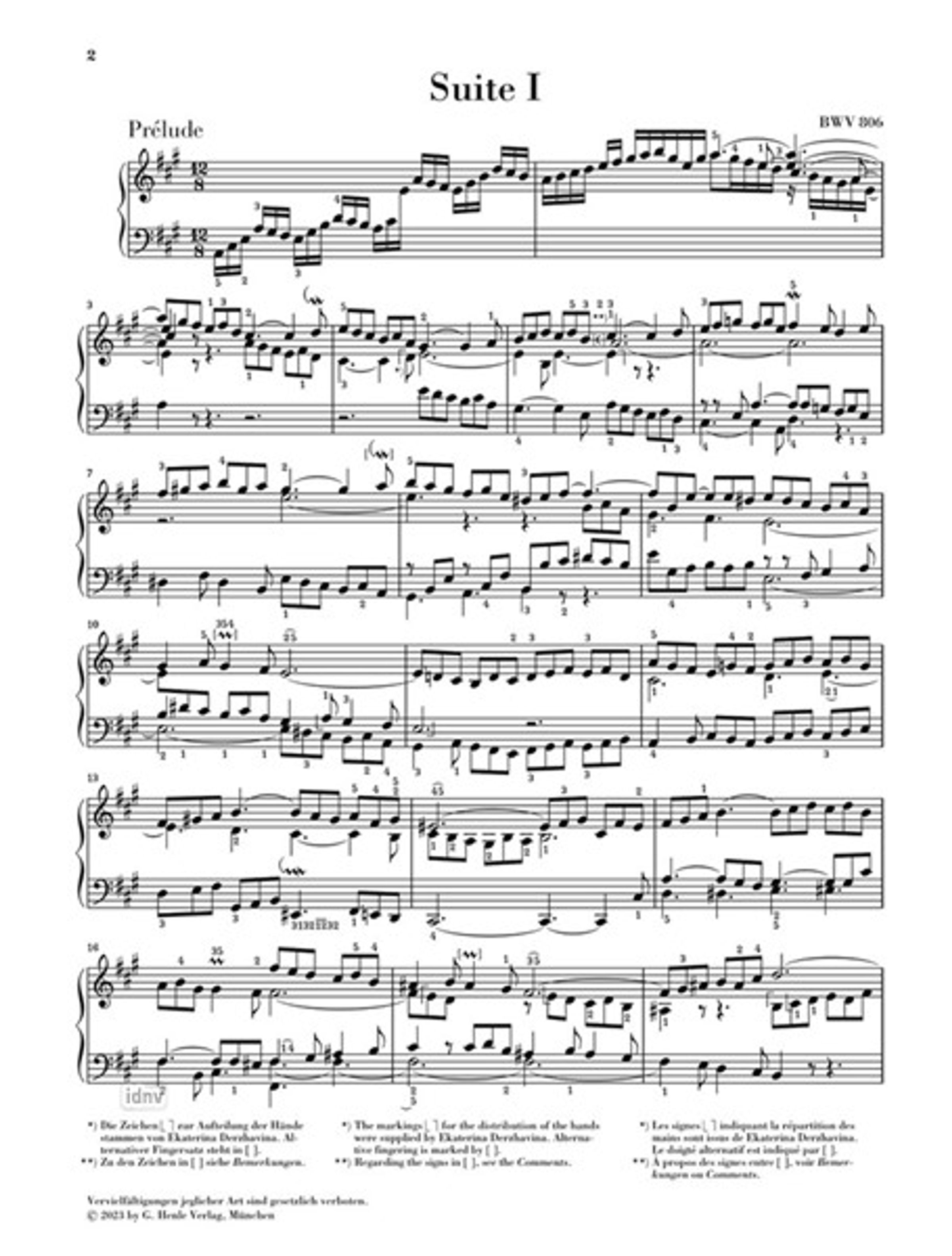 Der Beiname "Englische Suiten" stammt - genauso wie jener der "Französischen Suiten" - nicht von Bach. Im Gegensatz zu den intimen sechs "französischen" schlagen die "englischen" Suiten einen prächtigeren Tonfall an: Jede Suite wird von einem Prélude im konzertanten Stil eröffnet; für zwei Sarabanden sind von Bach zusätzlich ausgezierte Fassungen erhalten, die den virtuos-prunkvollen Cembalostil, der ihm hier vorschwebte, eindrücklich belegen. Auch wenn wir kein autographes Quellenmaterial kennen, ist der Notentext durch mehrere zeitgenössische Abschriften außergewöhnlich gut und zuverlässig überliefert. Authentische Varianten, vor allem zur Ornamentik, werden in der revidierten Urtextausgabe von Ullrich Scheideler mustergültig untersucht, dokumentiert und für den Spieler direkt im Notentext zugänglich gemacht. Mit Ekaterina Derzhavina hat diese Neuausgabe eine weitere Bach-Spezialistin an Bord, deren wohldurchdachter Fingersatz sicher durch Bachs "englischen" Suitenkosmos leitet.