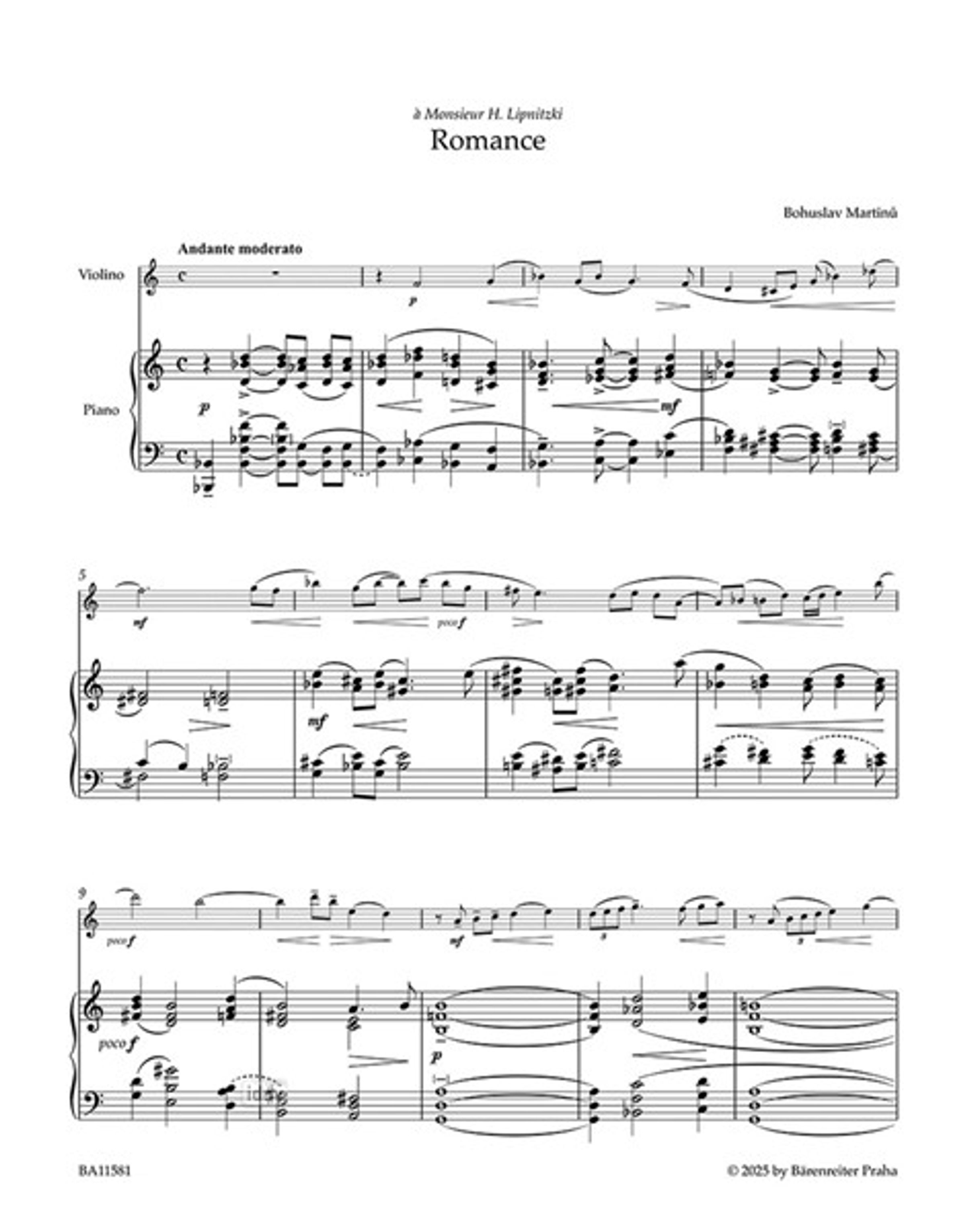 „MARTINŮ“, „BÄRENREITER URTEXT“, „Romance pro housle a klavír“, „for Violin and Piano“, „für Violine und Klavier“., Noten