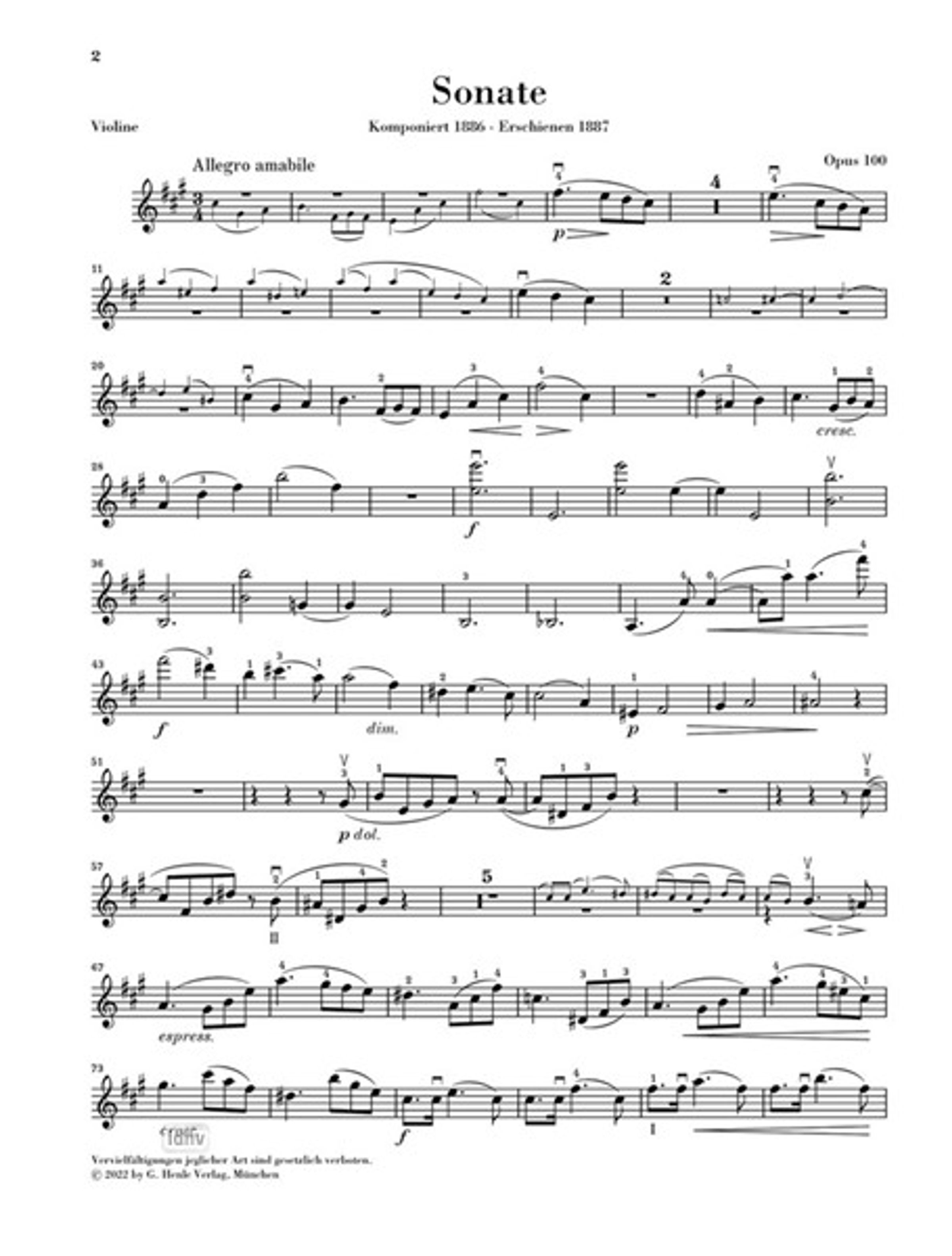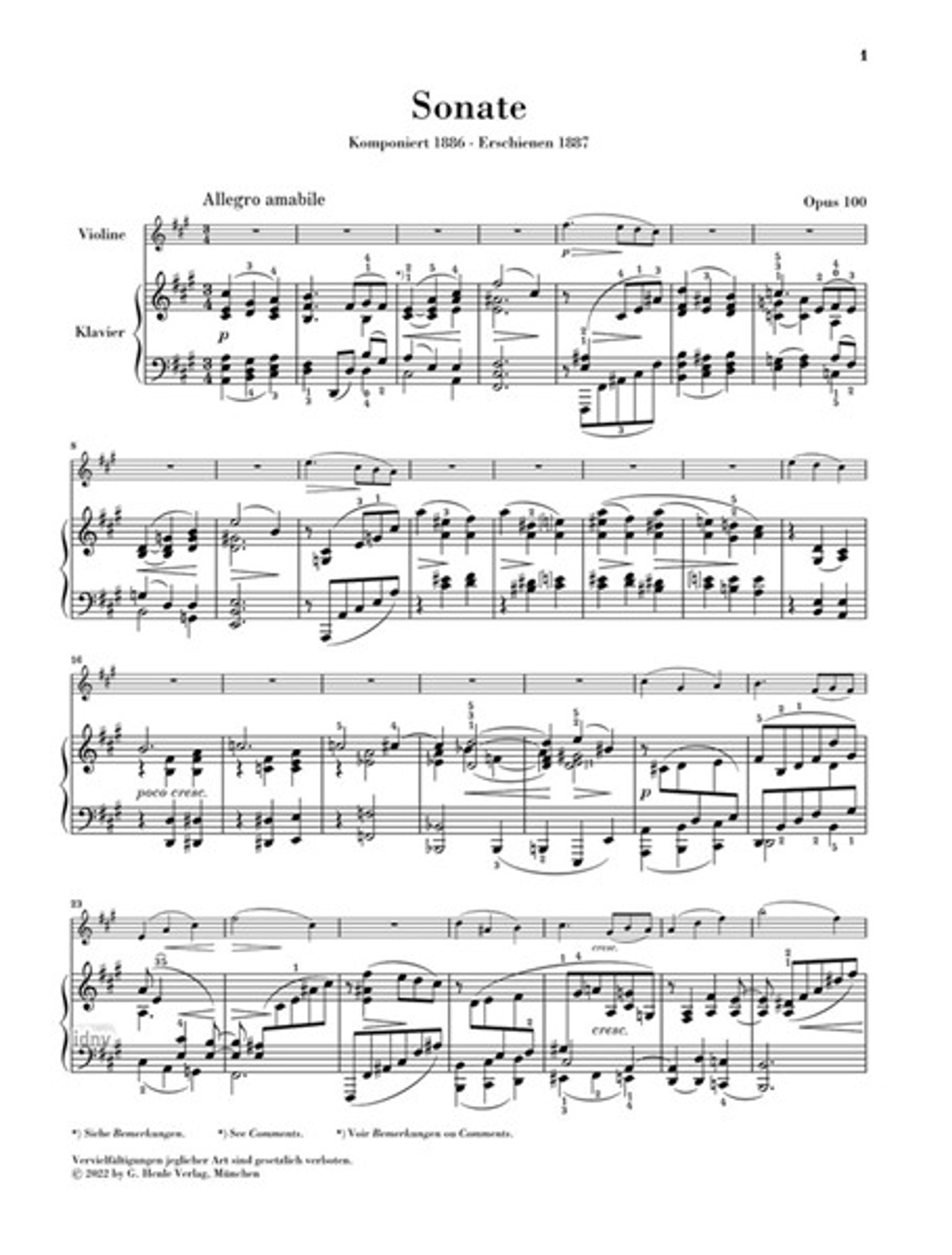 Während eines Sommeraufenthaltes im schweizerischen Thun komponierte Brahms 1886 gleich eine ganze Reihe von Kammermusikwerken, darunter auch die zweite Violinsonate in A-dur. Das wundervoll lyrische Werk gehört zu seinen heitersten Schöpfungen - der Biograph Max Kalbeck bezeichnete es hintersinnig als "Liebes- und Lieder-Sonate". Im Seitenthema des 1. Satzes zitiert Brahms das Kopfmotiv aus seinem eigenen Lied Wie Melodien zieht es mir, aber auch die übrigen Sätze sind von inniger Melodik geprägt. Den engen Zusammenhalt der kompositorischen Anlage erkannte bereits der Musikkritiker Eduard Hanslick: "Die drei Sätze bilden einen reinen Dreiklang einheitlich wohlthuender Stimmungen."Der Notentext dieser revidierten Urtextausgabe beruht auf dem neu erarbeiteten Band der Neuen Brahms Gesamtausgabe - Garant für höchste wissenschaftliche Genauigkeit. Mit Frank Peter Zimmermann und Martin Helmchen steuern zwei wahre Meister ihres Faches hilfreiche Fingersätze bei.