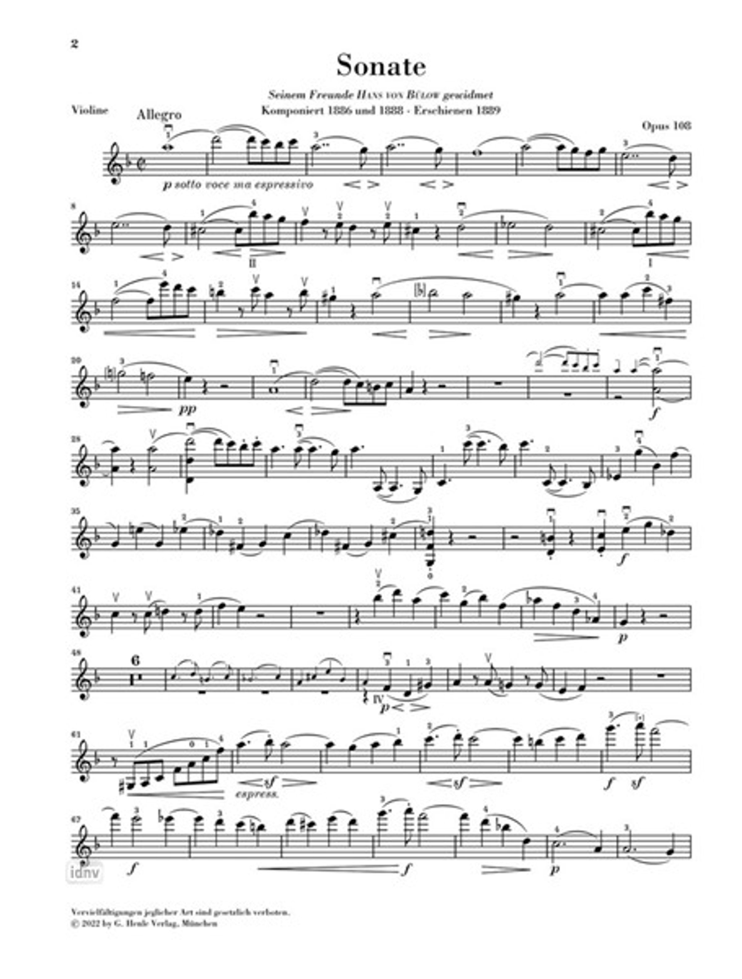 Die 1888 nach mehrjähriger Arbeit vollendete Violinsonate d-moll op. 108 ist Brahms' letzter Beitrag zu dieser Gattung. Im Gegensatz zu den beiden liedhaft-heiteren Sonaten in G-dur und A-dur präsentiert sich seine dritte Violinsonate als einzige in einer Molltonart, groß angelegt mit vier Sätzen und voller spannungsgeladener Dramatik. Das technisch und musikalisch gleichermaßen anspruchsvolle Werk wird gekrönt durch einen fulminanten Finalsatz, an dem schon Brahms' Zeitgenossen den "fortstürmenden Zug" bewunderten. Grund genug für den G. Henle Verlag, diese Sonate auch in einer Einzelausgabe anzubieten. Der Notentext dieser revidierten Urtextausgabe beruht auf dem Band der Neuen Brahms Gesamtausgabe, die höchste wissenschaftliche Genauigkeit garantiert. Die hilfreichen und musikalisch wohlüberlegten Fingersätze stammen vom bewährten Kammermusikduo Frank Peter Zimmermann und Martin Helmchen.