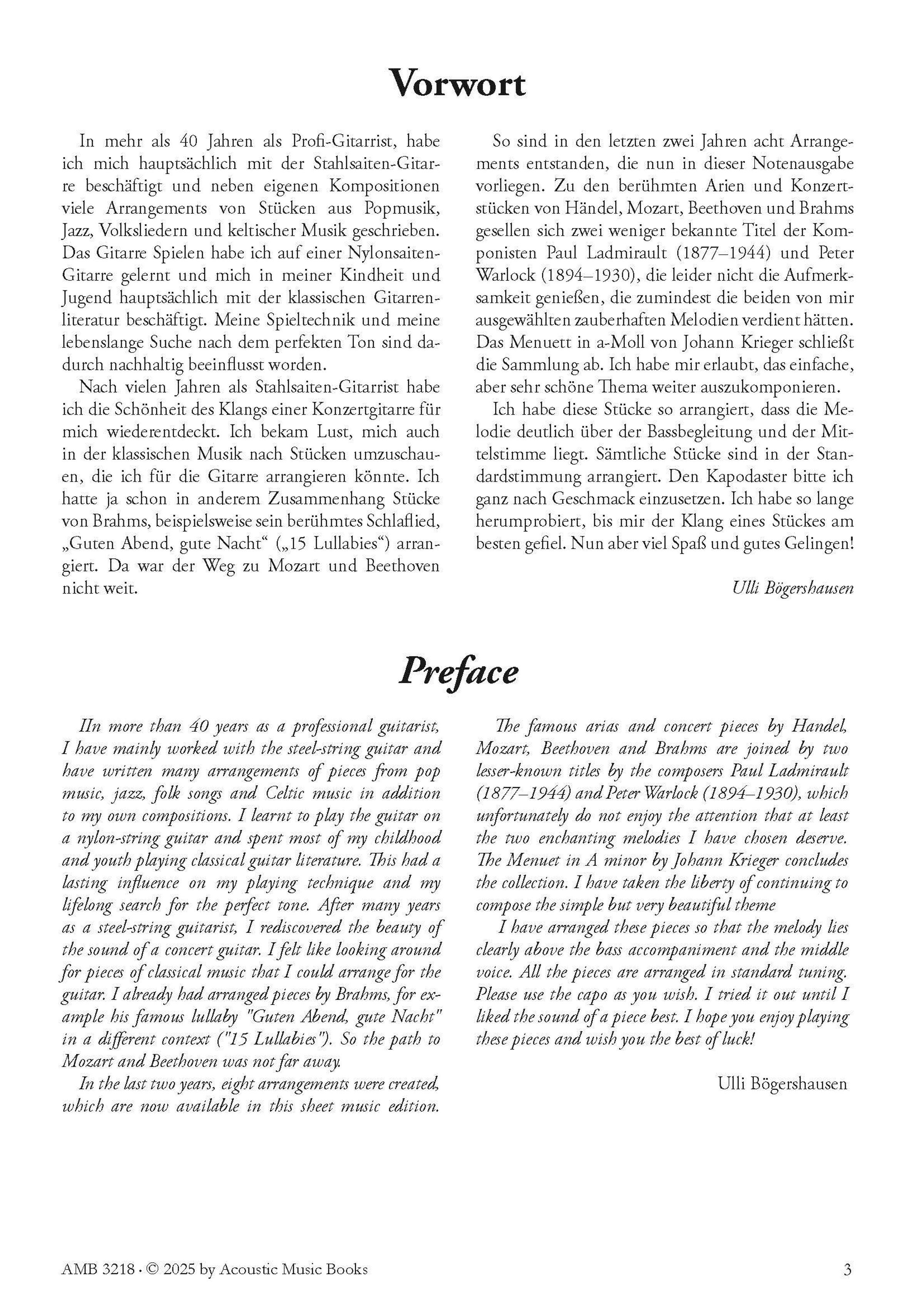 Nach vielen Jahren als Stahlsaiten-Gitarrist hat Ulli Bögershausen die Klangschönheit der Konzertgitarre für sich wiederentdeckt. Für dieses Ausgabe hat er acht Stücke aus dem Bereich der klassischen Musik arrangiert. Zu den berühmten Arien und Konzertstücken von Händel, Mozart, Beethoven und Brahms gesellen sich zwei weniger bekannte Titel der Komponisten Paul Ladmirault (1877-1944) und Peter Warlock (1894-1930), die leider nicht die Aufmerksamkeit genießen, die zumindest die beiden von mir ausgewählten zauberhaften Melodien verdient hätten. Das einfache, aber sehr schpne Thema des Menuett in A-Moll von Johann Krieger hat er weiter auskomponiert. Noten und TABs, DIN A4. Mit QR-Code zum Streamen der Tonaufnahmen