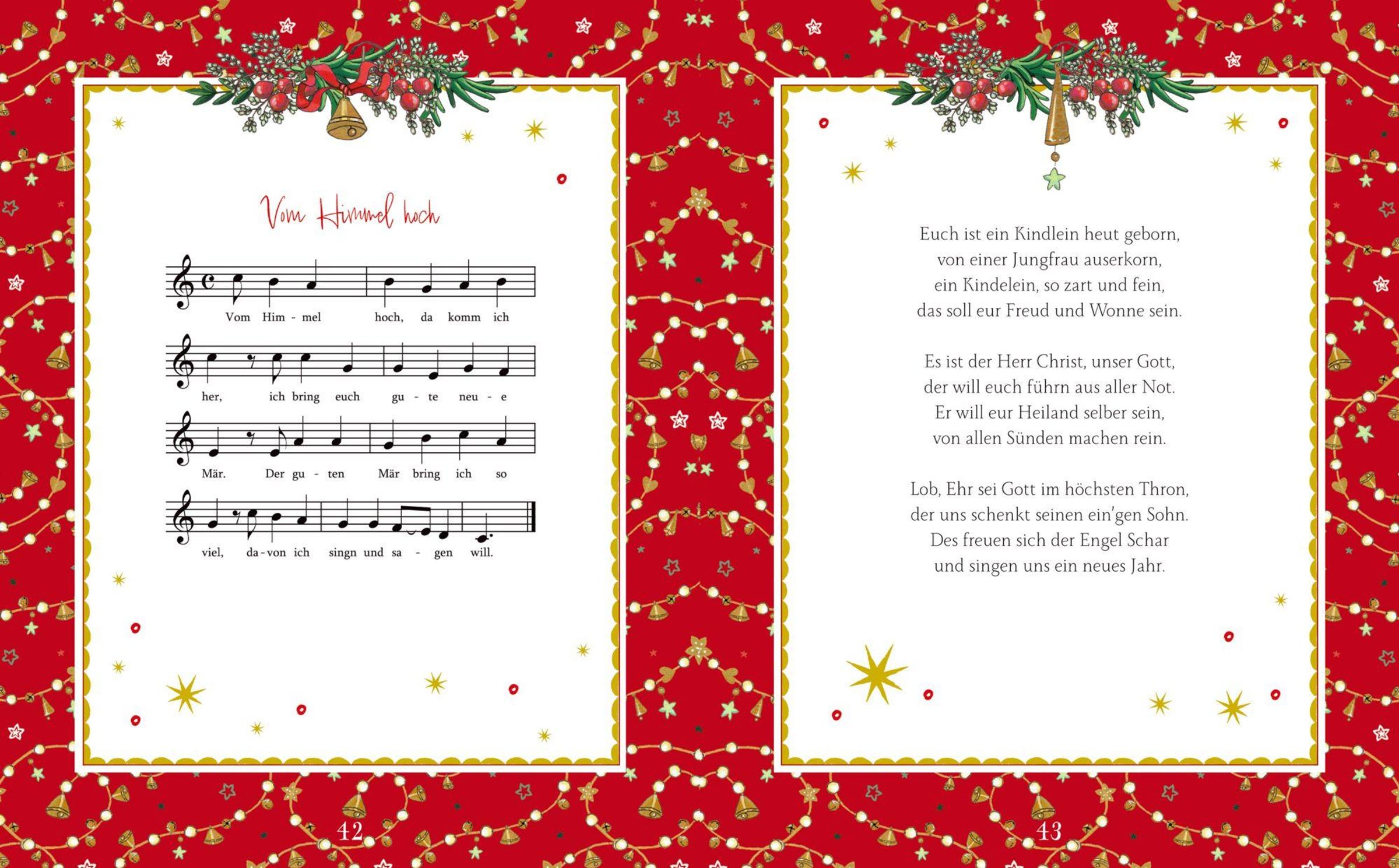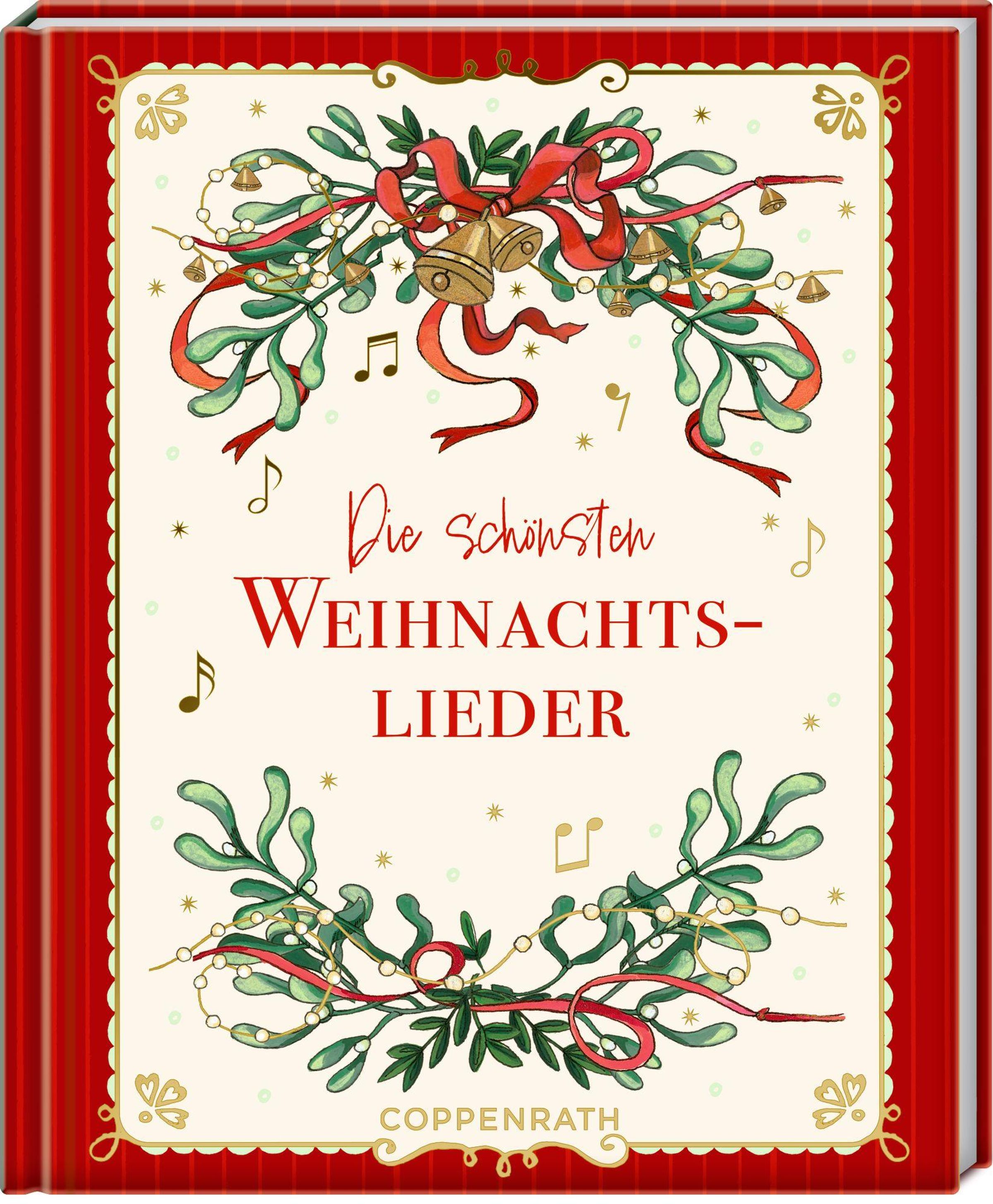 "Die schönsten Weihnachtslieder" in roter Schrift, grüner Zweig mit goldenen Glöckchen, roten Bändern und Noten., Buch