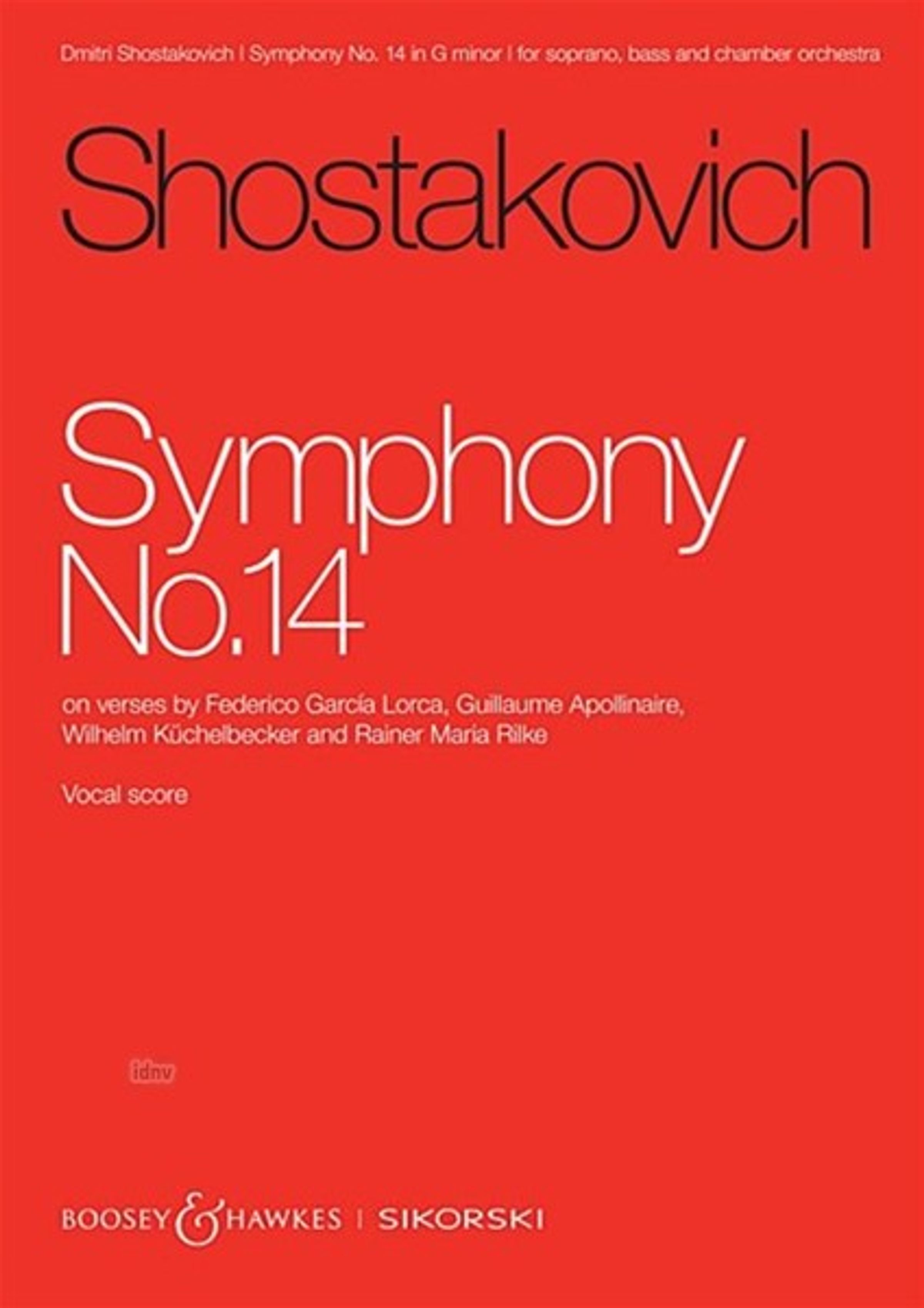 Shostakovich Symphony No. 14, für Sopran, Bass und Kammerorchester. Vertonungen von Lorca, Apollinaire, Küchelbecker, Rilke., Noten