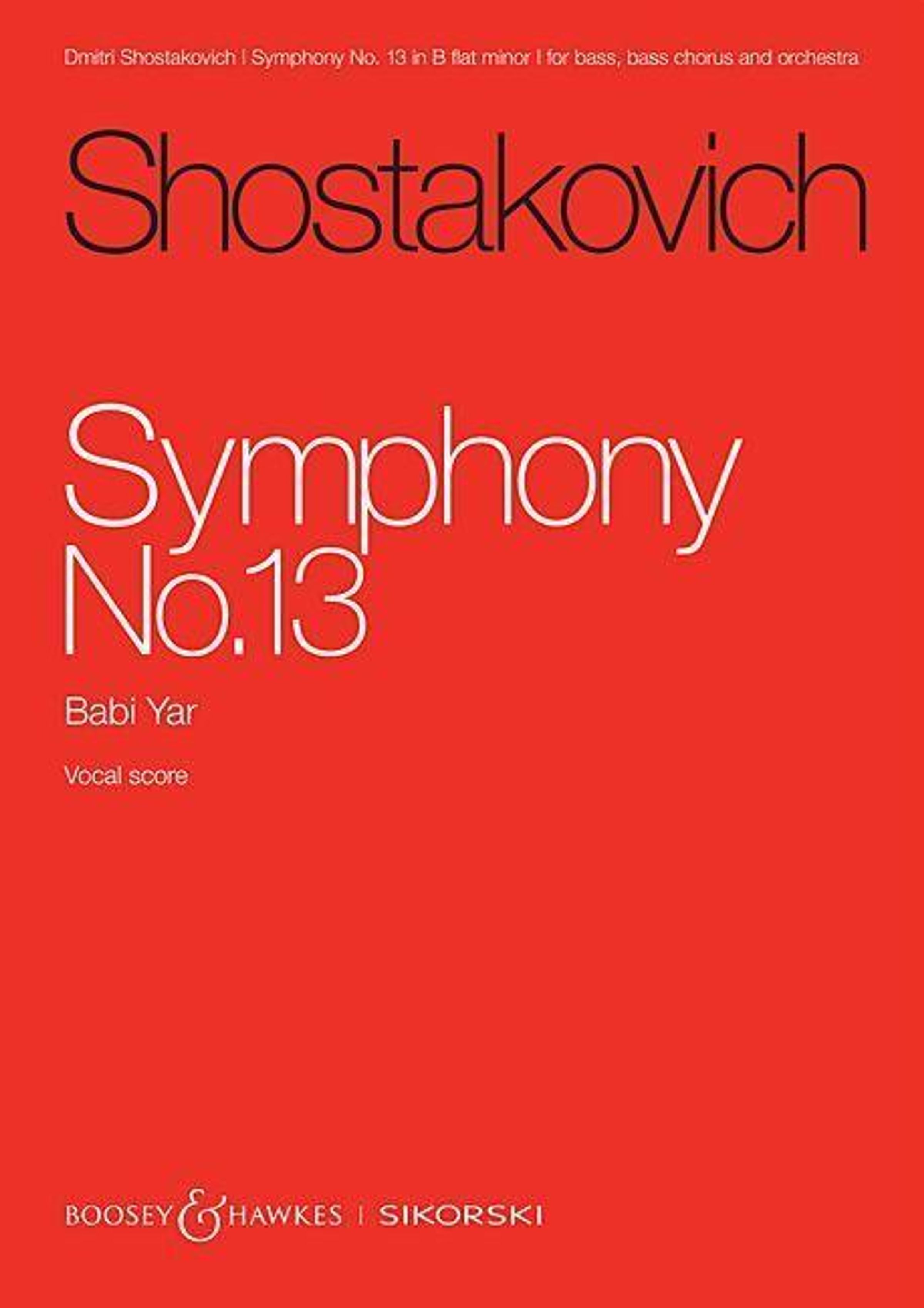 Text: "Shostakovich, Symphony No. 13, Babi Yar, Vocal score." Rote, minimalistische Covergestaltung., Buch