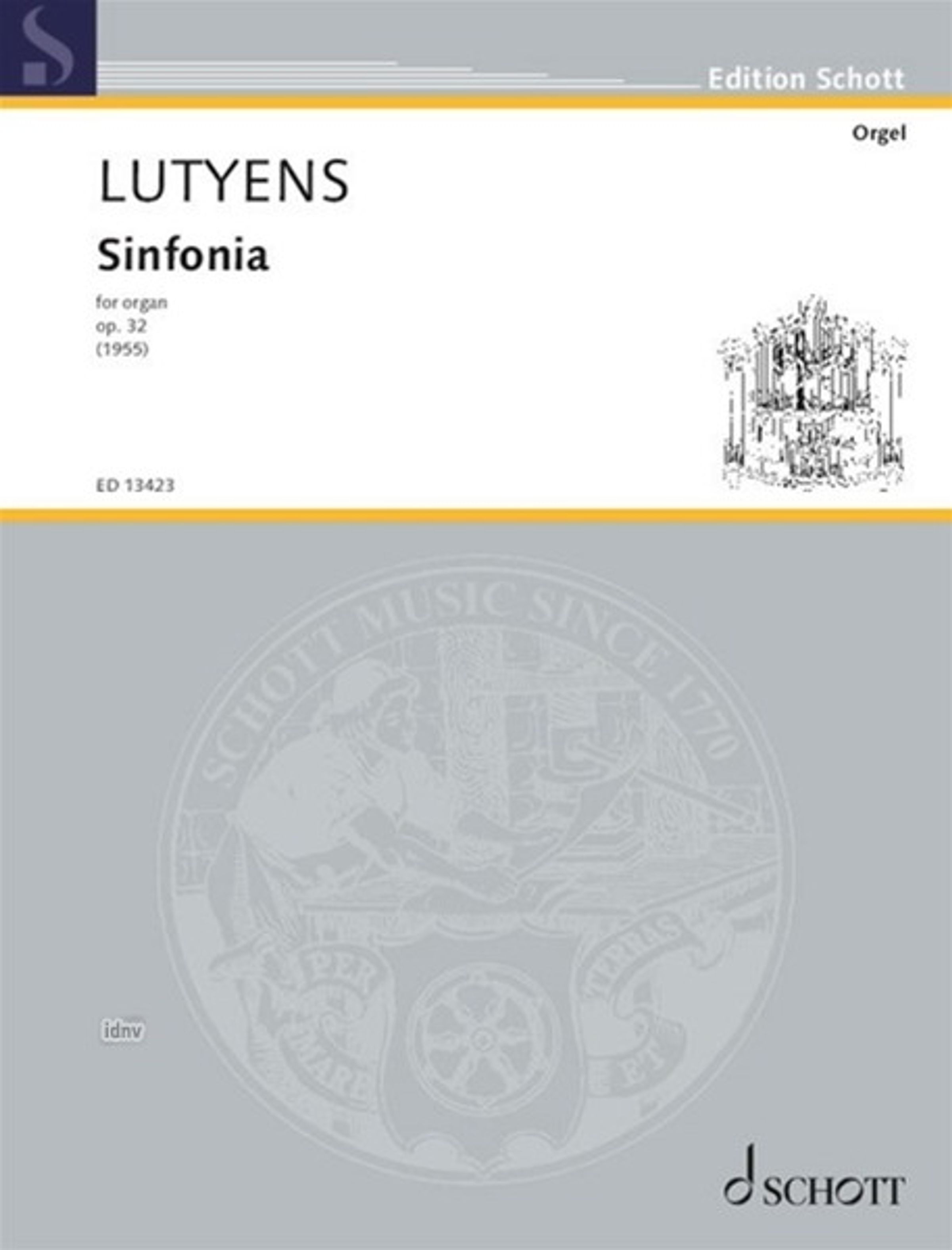 "LUTYENS Sinfonia for organ op. 32 (1955) ED 13423. Edition Schott. Illustration einer Orgel.", Noten