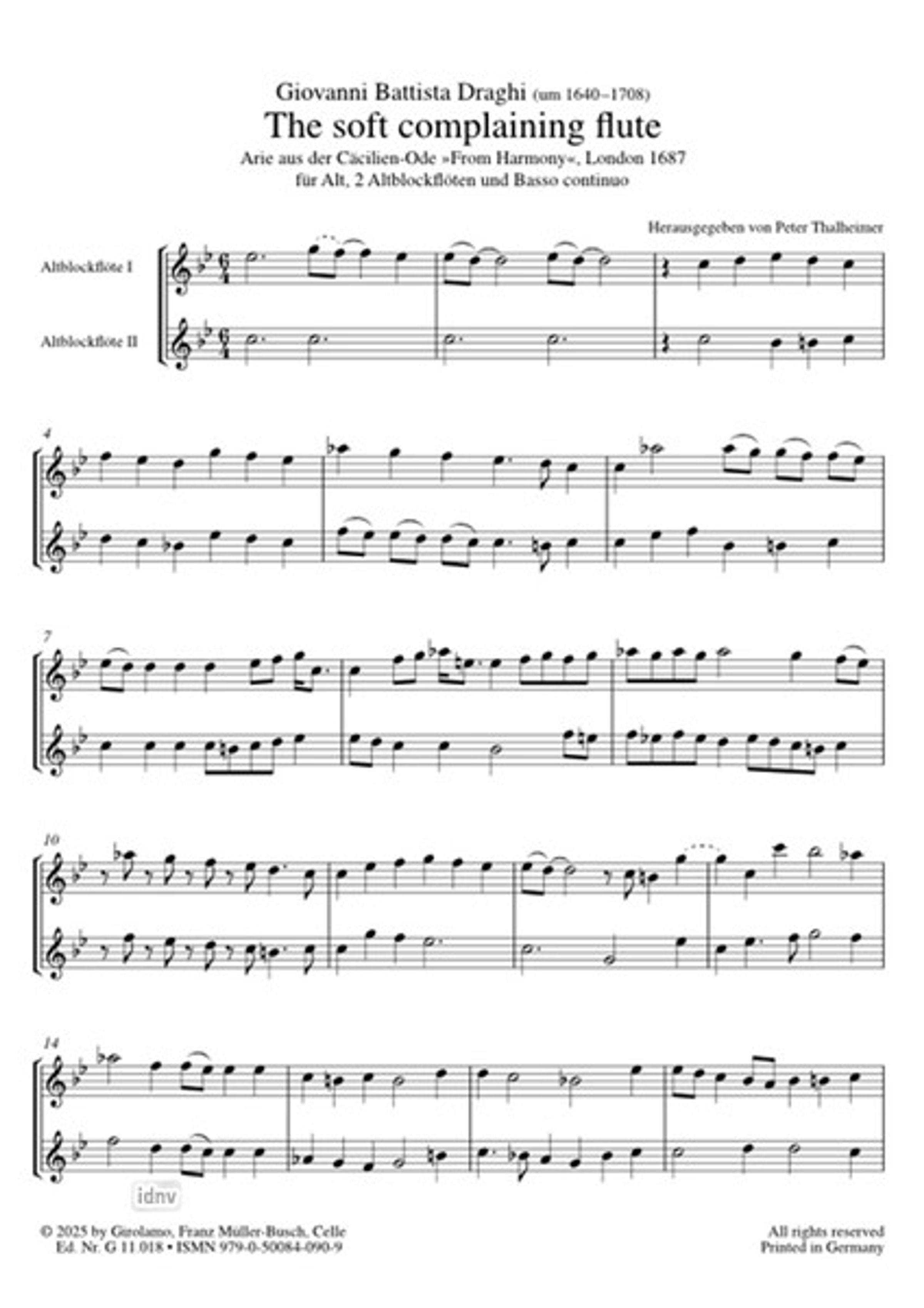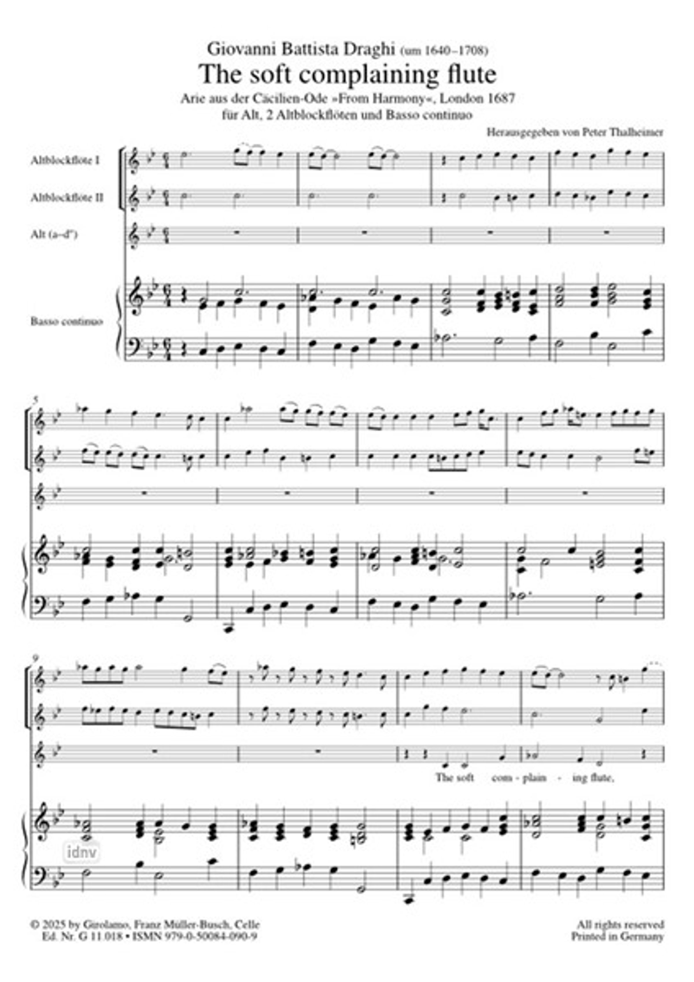 Giovanni Battista Draghi: The soft complaining flute für Alt, 2 Altblockflöten und Basso continuo