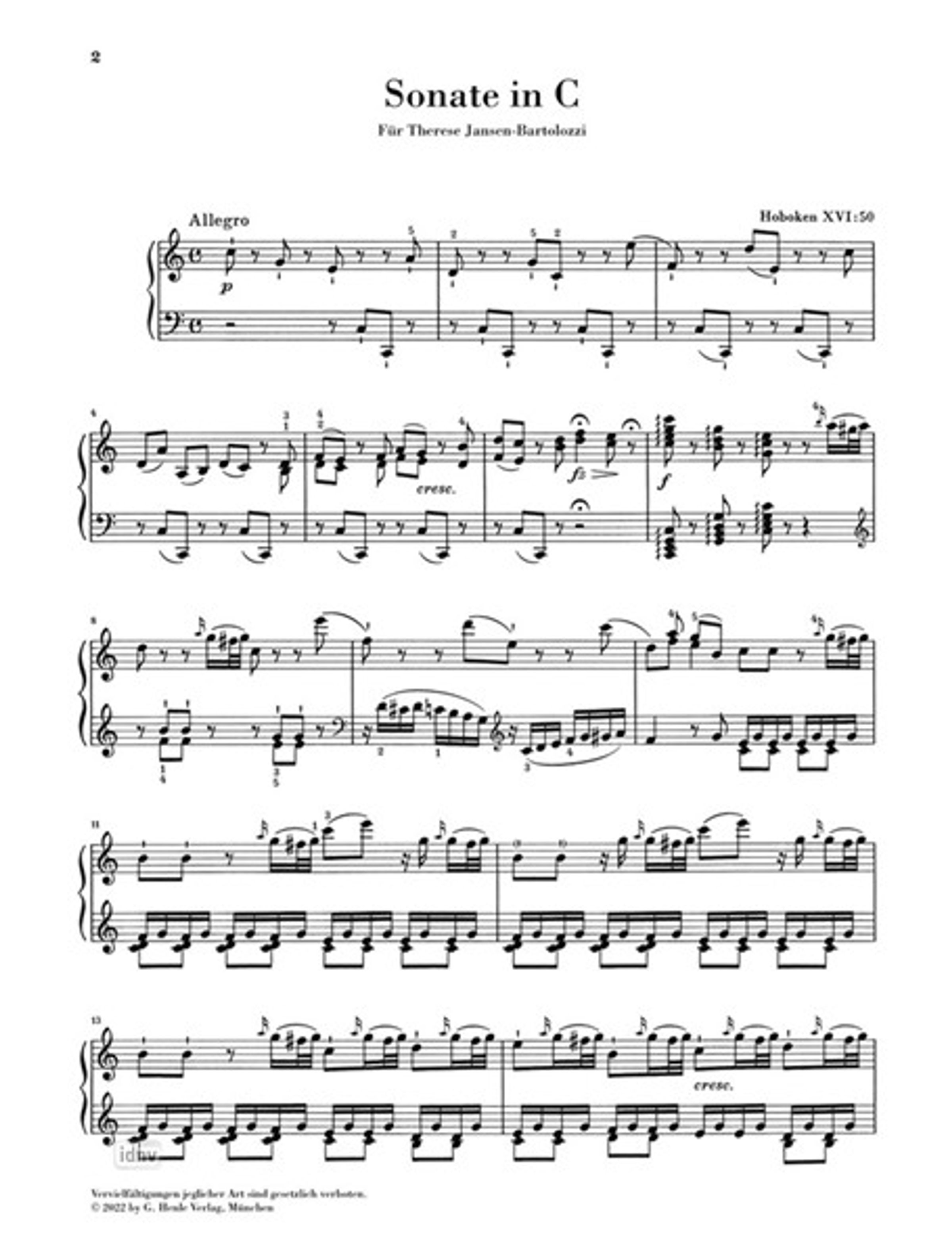 Die letzte der erhaltenen C-dur-Sonaten entstand während Haydns zweitem London-Aufenthalt 1794 / 95 für die Pianistin Terese Jansen, verheiratete Bartolozzi. Das Stück scheint ein sehr persönliches Dokument der Bewunderung für Jansen-Bartolozzi zu sein, denn Haydn (immerhin Trauzeuge bei ihrer Hochzeit 1795!) ließ die Londoner Erstausgabe mit dem Vermerk erscheinen "Composed expressly for and Dedicated to Mrs Bartolozzi". Zudem überließ er ihr das Eigentumsrecht an der Sonate. Dass der zweite Satz in einer leicht abweichenden Fassung bereits 1794 bei Artaria in Wien erschienen war, mag die Pianistin nicht gewusst haben ... Die revidierte Henle-Urtext-Einzelausgabe macht durch geschickt eingerichtete Ossia-Systeme beide Fassungen aufführbar und wartet zudem mit neuem Fingersatz von Christian Zacharias auf. Die begleitenden Texte beruhen auf dem neuesten Forschungsstand der Haydn-Gesamtausgabe.