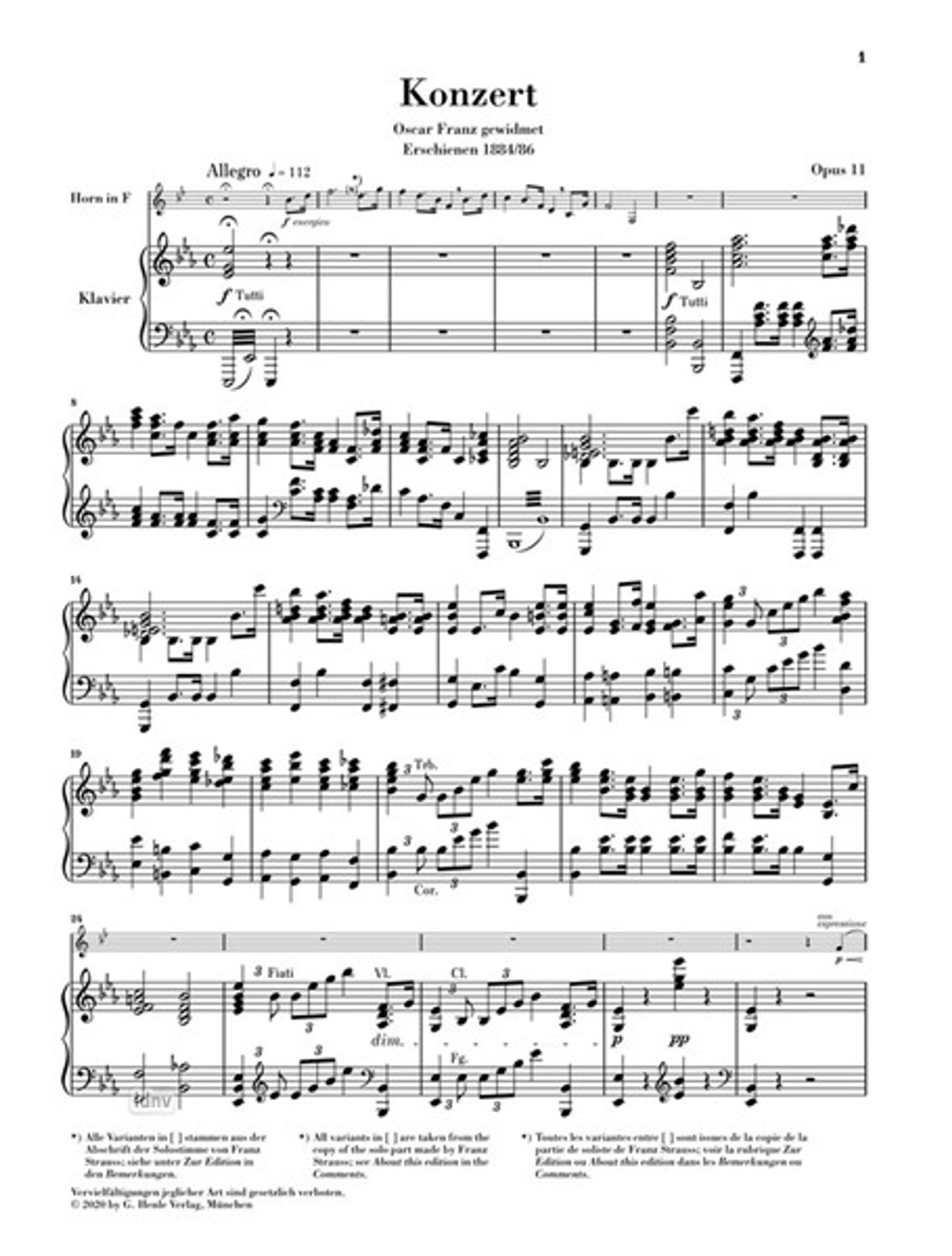 Mit seinem 1. Hornkonzert gelang dem erst 18-jährigen Richard Strauss ein hinreißender Geniestreich. Bis heute wird das Konzert auf der ganzen Welt (nicht nur) von Hornisten geliebt und zählt neben Mozarts Meisterwerken zu den unverzichtbaren Repertoirestücken für das Instrument. Peter Damm, ehemaliger Solohornist der Sächsischen Staatskapelle Dresden und Solist von Weltrang, hat das Konzert nicht nur über 170-mal selbst öffentlich aufgeführt, sondern auch grundlegende Forschungsergebnisse und Publikationen zu seiner Entstehungsgeschichte vorgelegt. Die von ihm herausgegebene Urtextausgabe, die sämtliche erhaltenen Quellen berücksichtigt, kann somit als Referenz-Edition angesehen werden. Zum Einstudieren im Unterricht und für Vorspiele ist der besonders gut spielbare Klavierauszug von Johannes Umbreit eine große Hilfe.Anmerkungen: