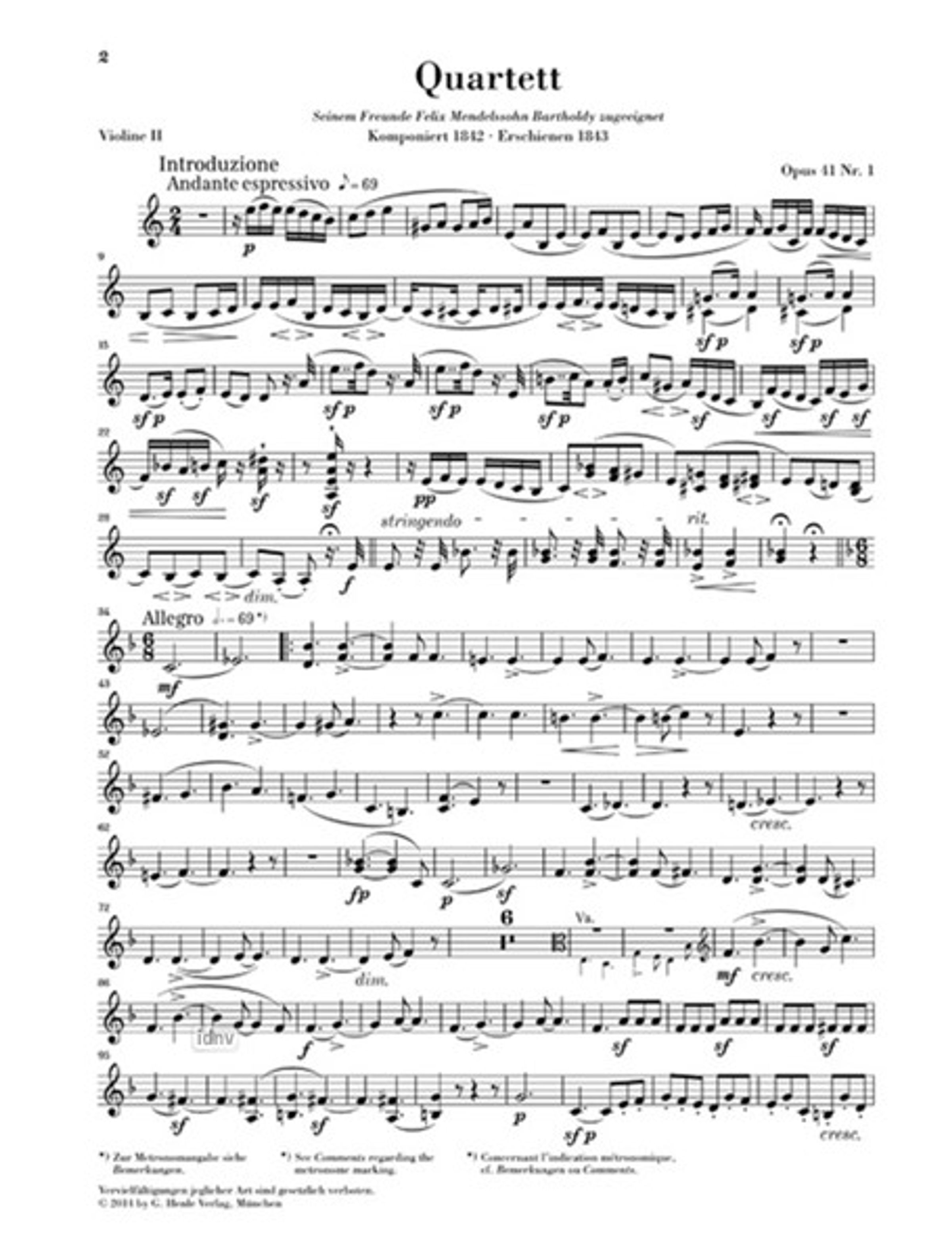 Während die ersten Kompositionsversuche Schumanns in dieser Königsdisziplin der Kammermusik von 1838 / 39 noch Fragment blieben, wurden die drei Streichquartette op. 41 in a-moll, F-dur und A-dur im Juni / Juli 1842 in einem Zuge niedergeschrieben. Bei den ersten privaten Aufführungen waren die Zuhörer begeistert, und namentlich Mendelssohns Lob veranlasste Schumann, seinem Freund die neuen Werke zu widmen. Entsprechend selbstbewusst schrieb der Komponist an seinen Verleger: "Verlassen Sie sich darauf, dass ich keine Mühe gespart, etwas recht Ordentliches hervorzubringen, ja ich denke mir manchmal, mein Bestes." Schumanns Opus 41 gehört heute bekanntlich zum Kernrepertoire aller Quartettspieler.Anmerkungen: