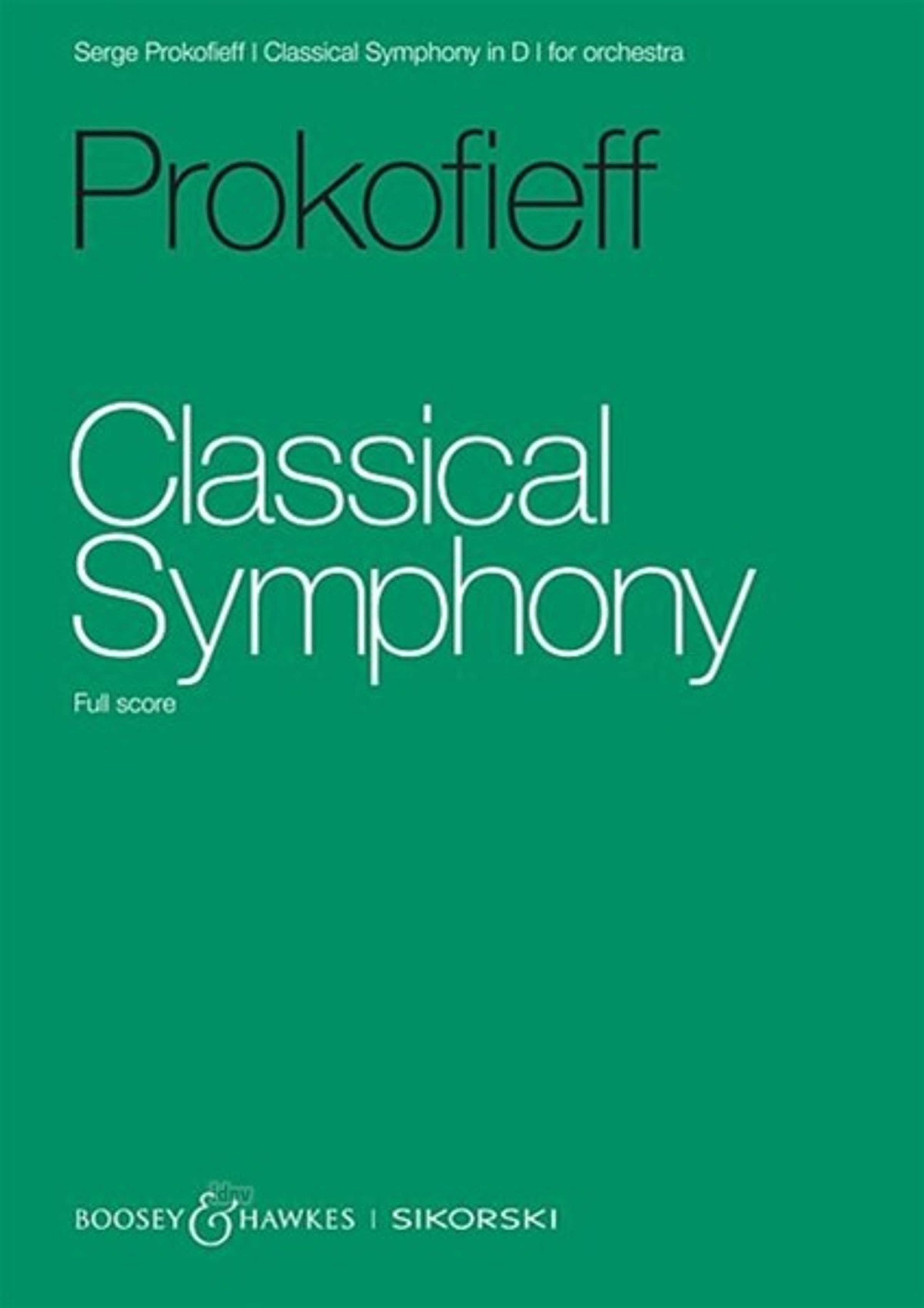 Grüner Hintergrund, Text: "Prokofieff Classical Symphony Full score". Unten: Verlagsnamen und Logo., Noten